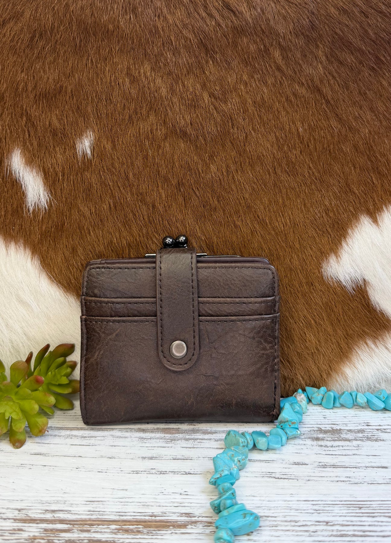 Wrangler Leopard Print Small Bi-Fold with Kiss Clasp Coin Purse 4.5" x 1" X 3.75" Leopard print Wrangler logo on the front Flap with magnetic button closure RFID Protected This coin purse features 8 card slots and 1 bill slot and a kiss-lock coin pocket for organization.