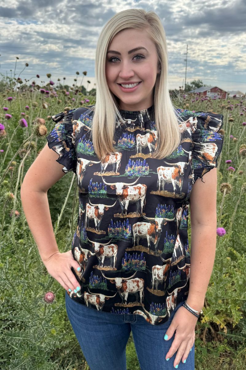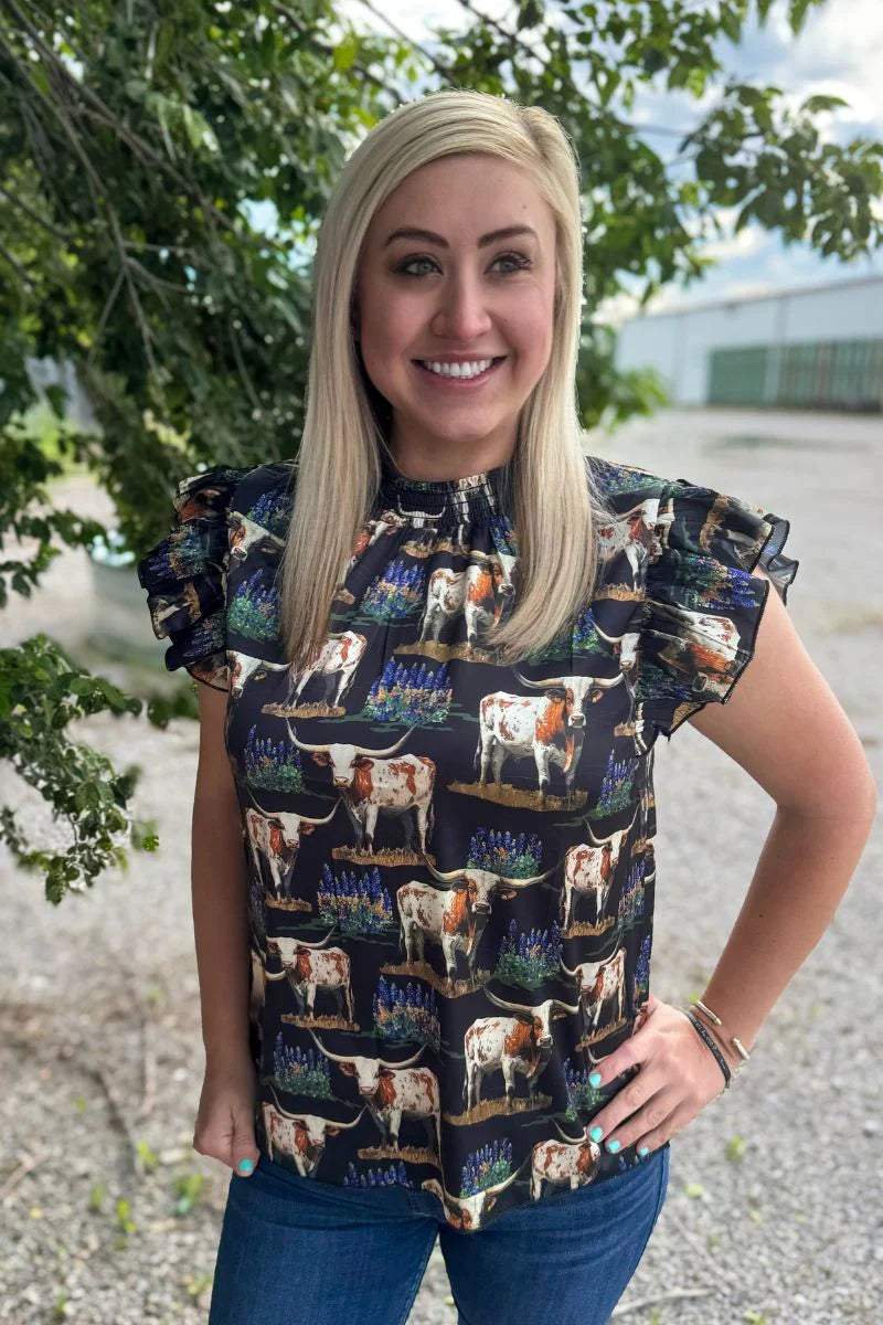 Embrace Texas charm with Sterling Kreek's "Somewhere In Texas Top"! This adorable blouse features sweet ruffled short sleeves and a playful pattern of bluebonnets and longhorns that celebrates Lone Star pride. Stylishly elegant yet wonderfully comfortable, it's the perfect addition to your wardrobe for showing off your Texas spirit with a touch of feminine flair.